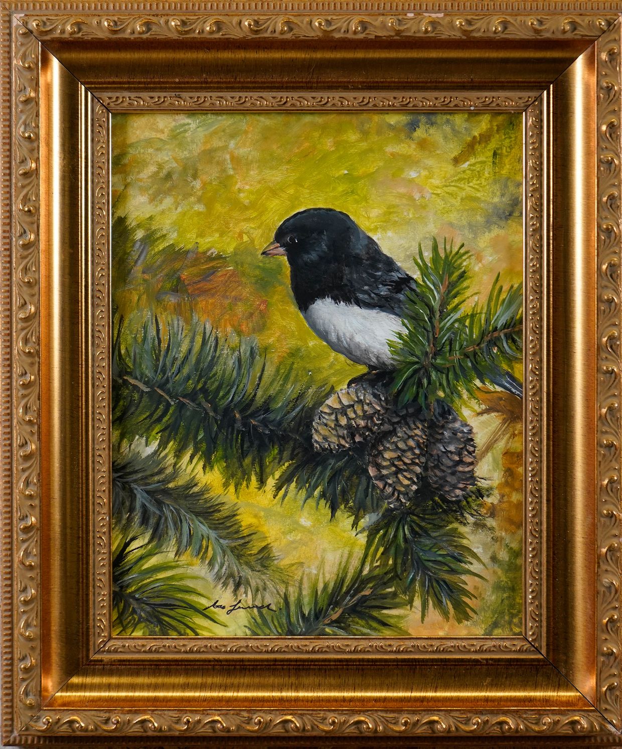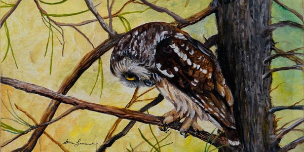 In a sense, Saw Whet Owls are responsible for my career as a wildlife artist. Creating an indelible impression on a young boy helping his photographer father relocate these owls to a lower vantage point, they became a touchstone in my life. In every media in which I have worked, I have portrayed these owls. "Courtship" is painted on a wraparound panel, designed to be displayed either on the wall a shelf or free standing